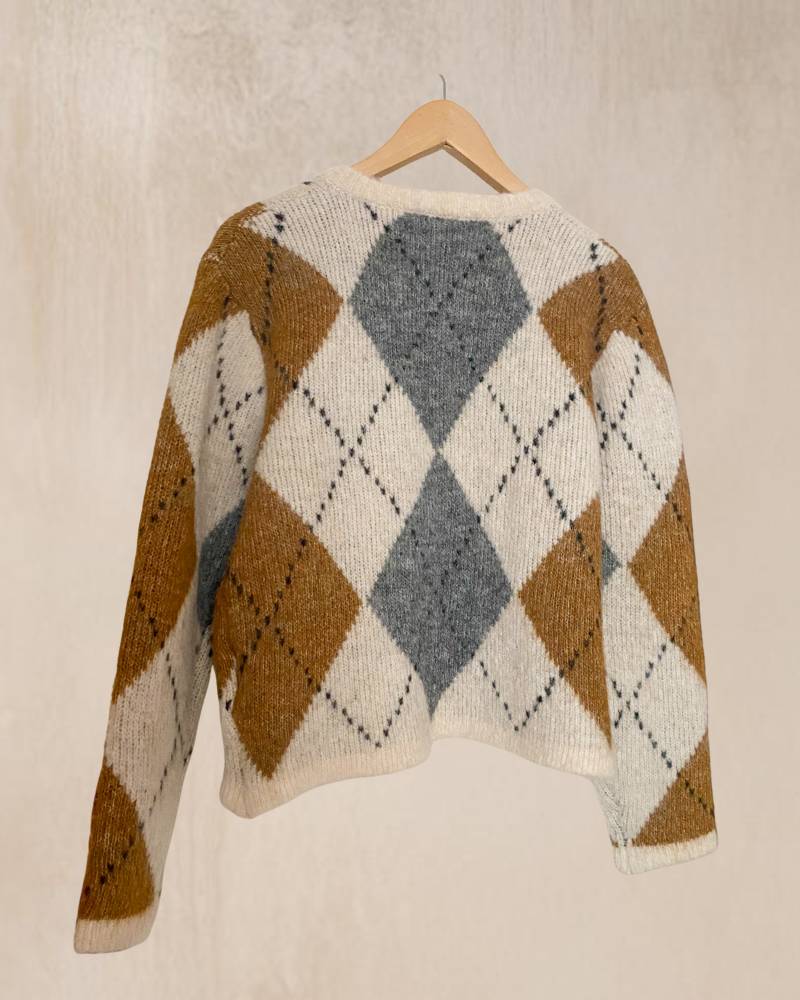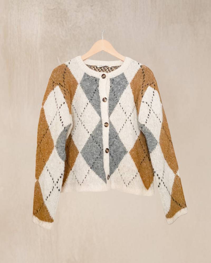 Cardigan de rombos en colores mostaza y gris.