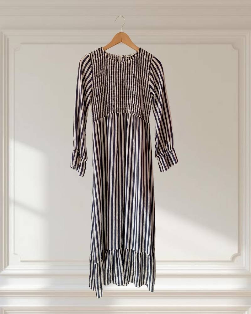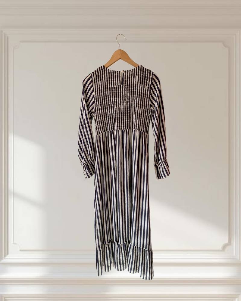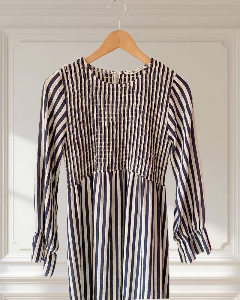 Vestido de rayas con nido de abeja. Color crudo y azul marino.